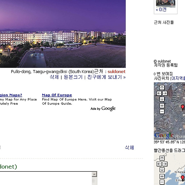 구글 구글어스에 사진등록하기! 구글어스에 사진등록 하는것을 알아보다가 등록하는 사이트를 알아내었다.. 사이트 주소는 http://www.panoramio.com 한글로도 보이기 때문에 등록하는 방법은 그리 어렵지 않을 것이다.. 간략하게 설명하자면....처음 이용하는 사람은 맨처음 이메일과 비밀번호를 등록한 후 [adsense1] 그 등록한 이메일주소로 로그인을 하고..사진등록 하기를 눌러서 사진을 등록하고. 옆에 지도에서 위치를 지정한후 저장하면 된다.. 그리고 등록후 바로 뜨는것이 아니라 몇주후에나 등록이 된다.. 100%다 등록이 된다는것은 보장을 못한다..대충 보니깐..간략한 심사를 통해 등록이 된다는데.. 왠만하면 등록해주지 않을까...싶다.... 우선 내 주변에 있는 것들부터 등록을 해봐야 겠다.. 학교..집....친구집... -